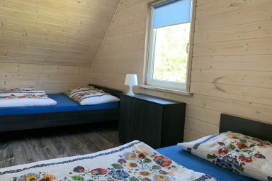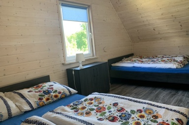 - 2 oddzielne sypialnie na piętrze, wyposażone w poduszki, kołdry, pościel,w jednej sypialni dwa duże łóżka podwójne, w drugiej duże łóżko małżeńskie i jedno łóżko pojedyncze